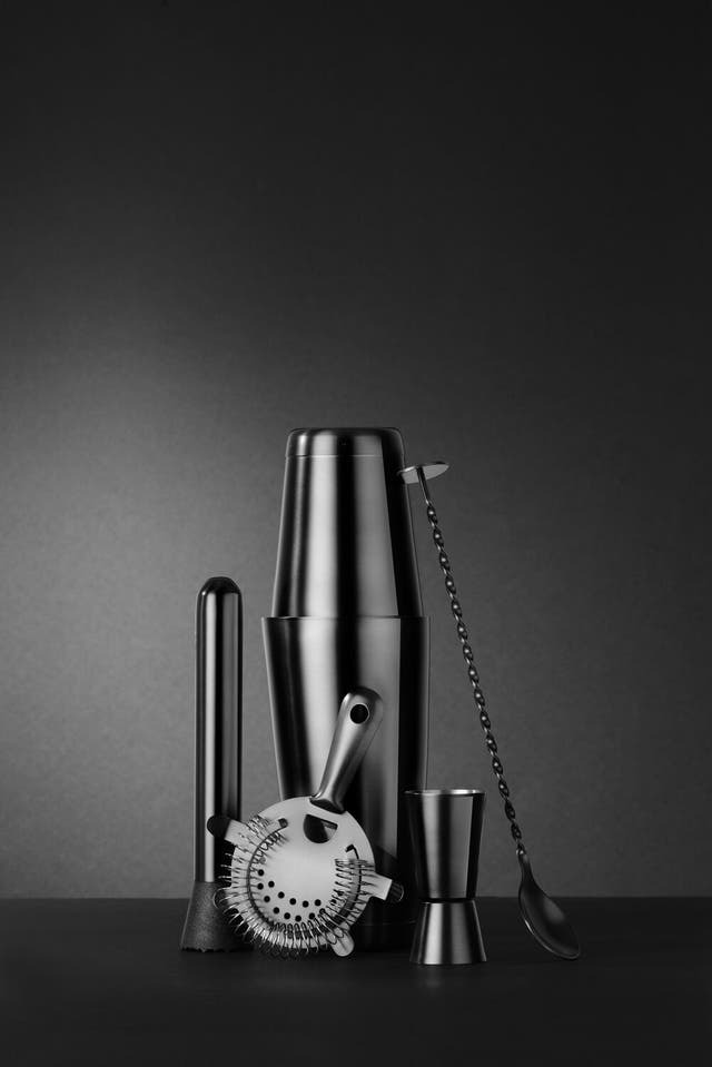 Valmistatud roostevabast. Muddleri ots on valmistatud polüpropüleenist (PP). Paksust papist valmistatud toru. Boston shaker Tin-on-Tin: 2 kaaluga tassi, mahutavusega 500 ml ja 800 ml. Klassikaline žigger mahuga 50 ml ja 25 ml. Hawthorne’i sõel: ergonoomilise käepidemega ja eemaldatava vedruga (lihtsaks puhastamiseks, saab kasutada ka “vedruviskina”). Sobib ideaalselt šeikerisse, puhastab põhjalikult jää, puuviljad ja maitsetaimed. Muddler: hammastatud pinnaga puuviljade ja maitsetaimede vaevata purustamiseks. 27 cm pikkune ja 5 ml mahutavusega spiraalne baarilusikas koos muddleriga (ots on kettakujuline): jääjookide kiireks segamiseks ilma neid lahjendamata, limonaadi valamiseks ilma vahutamata ja kihiliste kokteilide loomiseks. Kettaga muddlerit saab kasutada ka puuviljade ja maitsetaimede purustamiseks. Komplekt on pandud papptuubi ja elegantse kujundusega. Komplekti osad ei ole nõudepesumasinas pestavad.