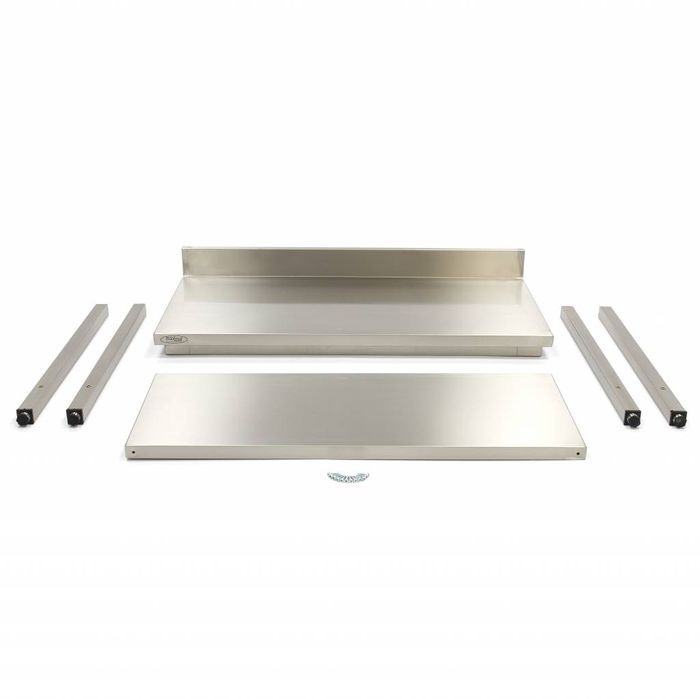Toitlustusköögis on ohutus väga oluline. Sellepärast on sellel laual volditud servad, mis on keevitatud ja poleeritud. See loob korralikult viimistletud tööpinna ilma teravate servadeta. Lisaks on sellel töötasapinnal tagaküljel kõrgendatud serv, et kaitsta seina pritsmete eest. Töölaua alt leiate riiuli. See ei ole reguleeritava kõrgusega, kuid sobib köögitarvikute hoidmiseks või täiendavaks panipaigaks. Tarnimisel saate laua komplekteerituna, kuid 10 minutiga saate selle professionaalse roostevabast terasest töölaua kokku panna ja see on kasutusvalmis. Laua kokkupanekuks vajalikud tööriistad on standardselt kaasas.